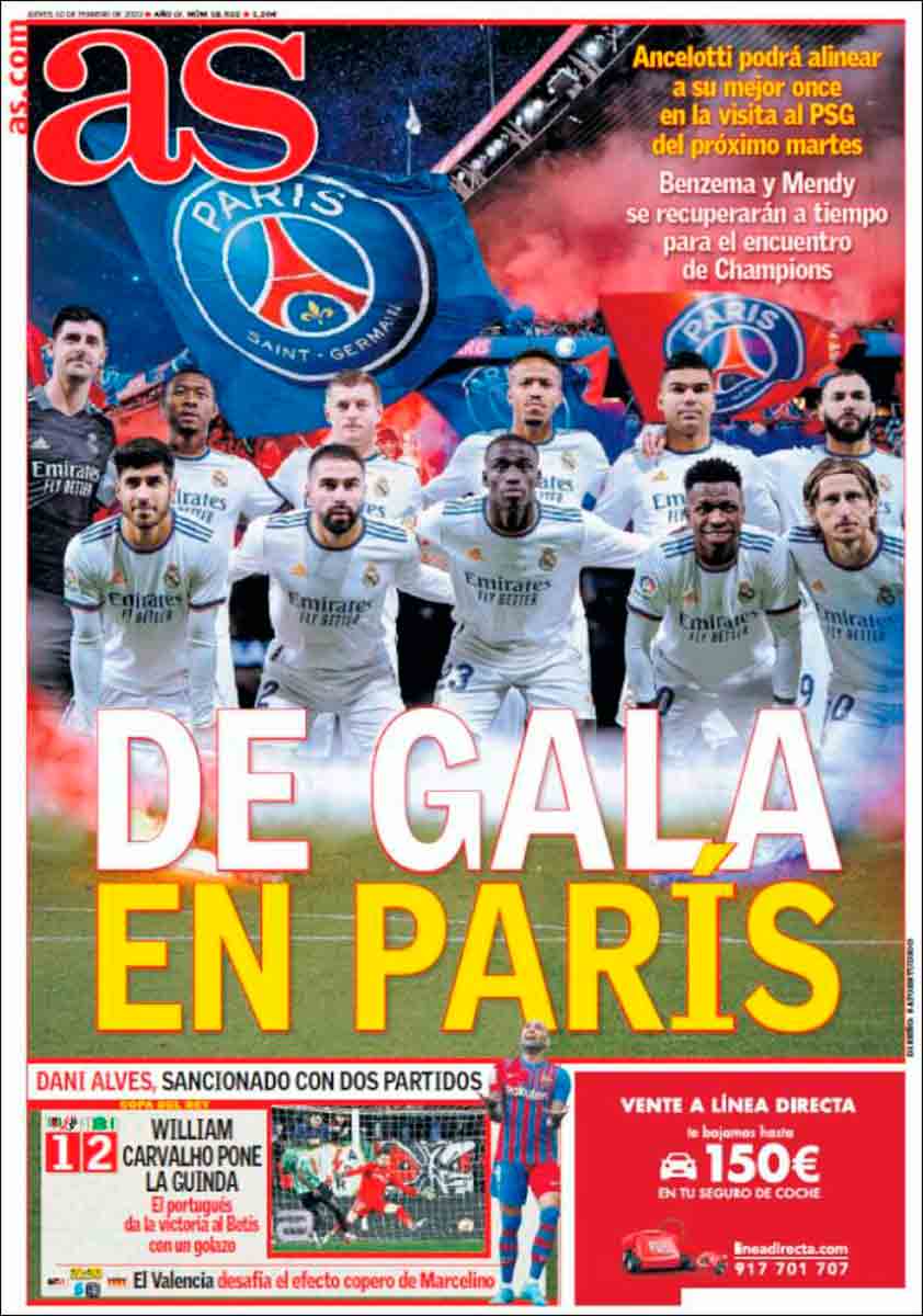 “De Gala en París” titula As. Como la mujer de Dalí de mismo nombre cuando se casó, precisamente en París, con el propio Dalí allá por 1932. El asunto principal para As —y para la mayoría de medios madrileños— es el duelo de Champions entre el Madrid y el PSG de la próxima semana. Ocurre algo curioso, porque todo el mundo parece desdeñar la importancia del partido frente al Villarreal de este sábado. Como madridistas, sabemos que lo capital es la Champions, pero también que, en este momento, ganar la Liga es más factible y el Madrid no puede permitirse tirarla por la borda. Además, un buen resultado frente al Villarreal insuflaría más ánimos al equipo de cara a su duelo parisino.
