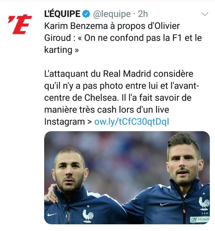 He leído que le han preguntado a Benzema sobre Giroud, el delantero titular de la selección francesa, y el madridista ha respondido: “¿Comparaciones con Giroud? No confundas un Fórmula Uno con un kart”. La frase proviene de un directo en Instagram en el que el lionés ha respondido a preguntas de los aficionados e incluso ha hablado con Ronaldo Nazario, a quien le ha dicho que para él es el mejor, por delante de Zidane.