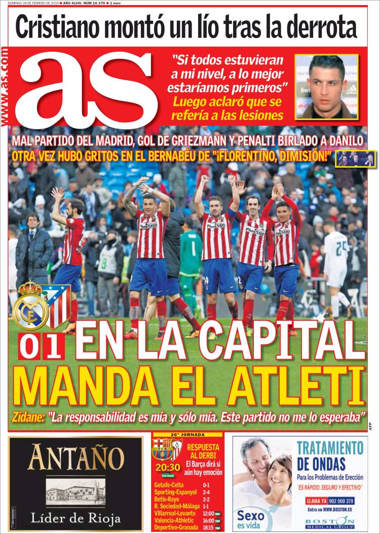 Tenemos que agradecer al diario As que sea el único que mencione un penalti de Gabi a Danilo, de esos que no sabemos cómo es posible no pitar, salvo que la Liga, como bien dijo en verano el oráculo Diego Pablo, esté peligrosamente preparada para que la gane la madre que nos parió (disculpen ustedes el exabrupto, pero hasta nos hemos contenido). Sin embargo, esa mención al enésimo penalti no pitado casi se nos pierde en una portada que parece encantada de titular como titula ("En la capital manda el Atleti") y que parece aún más encantada -miren ustedes la foto alusiva- con las torpes y altaneras declaraciones postpartido de Cristiano.