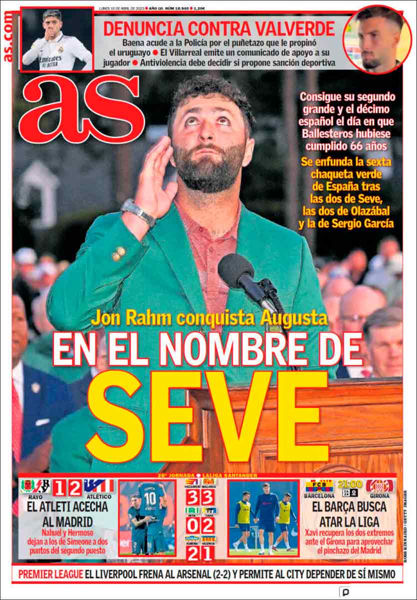 Las portadas del día recogen el incidente que traerá cola a buen seguro, también aquí en La Galerna, aunque los principales espacios van destinados a Jon Rham, a quien felicitamos por el Open de Augusta, por parte de la prensa madrileña, y a la negreiliga que está cerca de adjudicarse el club que compra las voluntades del estamento arbitral, por parte de la prensa cataculé.