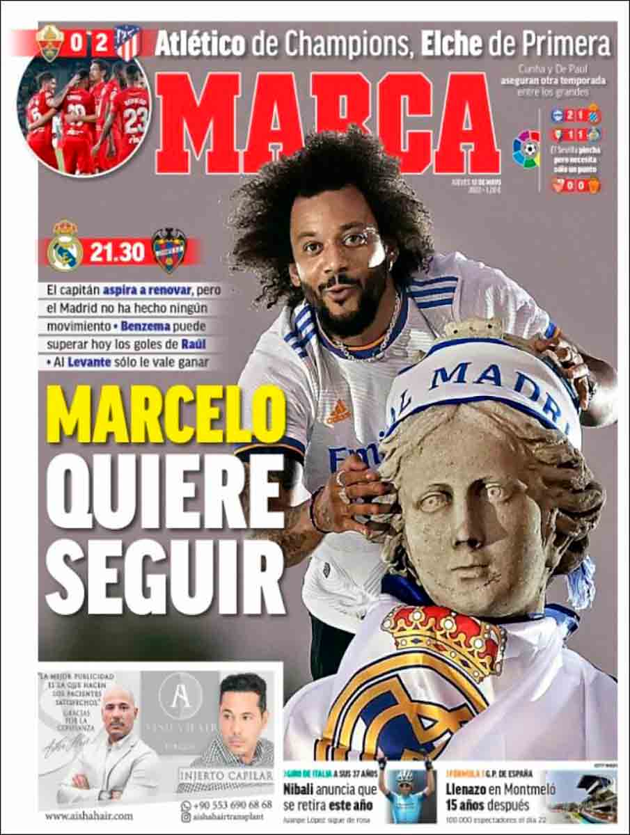 Buenos días. La portada de Marca viene con una punzada de admiración, otra de emoción y una tercera de incomodidad. Se trata de Marcelo, alguien a quien se le puede aplicar la palabra mito, la palabra leyenda, sin el menor temor de caer en la hipérbole. Aprovechamos para felicitarlo porque hoy cumple 34 años. Queremos tanto a Marcelo, podríamos (y tal vez podremos) titular el portanálisis de hoy, parafraseando el título de aquel cuento de Cortázar. Le queremos mucho. Mira, lector, el palmarés de Marcelo con nuestro club, donde llegó siendo un niño, y póstrate. Pero sobre todo mira dentro de tu propia memoria, escudriña en la cantidad de veces que te ha arrancado un suspiro extasiado con un gesto técnico sublime, un control sobrenatural o uno de esos centros milimétricos (aún los pone) a la cabeza de Raúl, Van Nistelrooy, Ronaldo Nazário, Cristiano Ronaldo o Benzema.