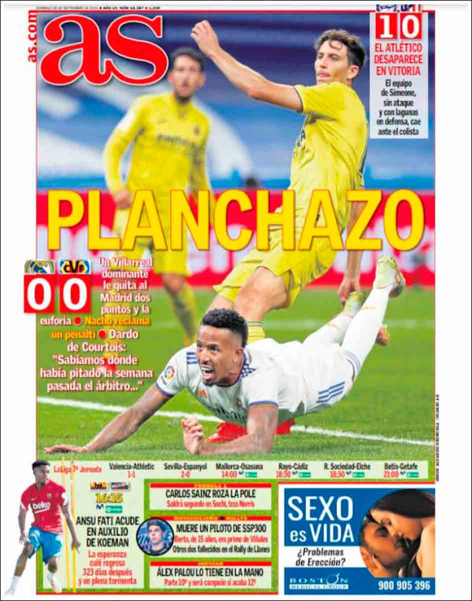 La ocasión más clara de gol que tuvo el Madrid fue un remate de cabeza de Militão a pase medido de Asensio desde la izquierda, que incomprensiblemente se fue fuera, pese a estar el defensa en estupenda posición para marcar. Cosas que pasan. Ahí está As para ilustrar el fiasco con su foto y con su titular, si bien lo mejor de su primera plana esconde la verdadera personalidad del ya citado Nacho Fernández.