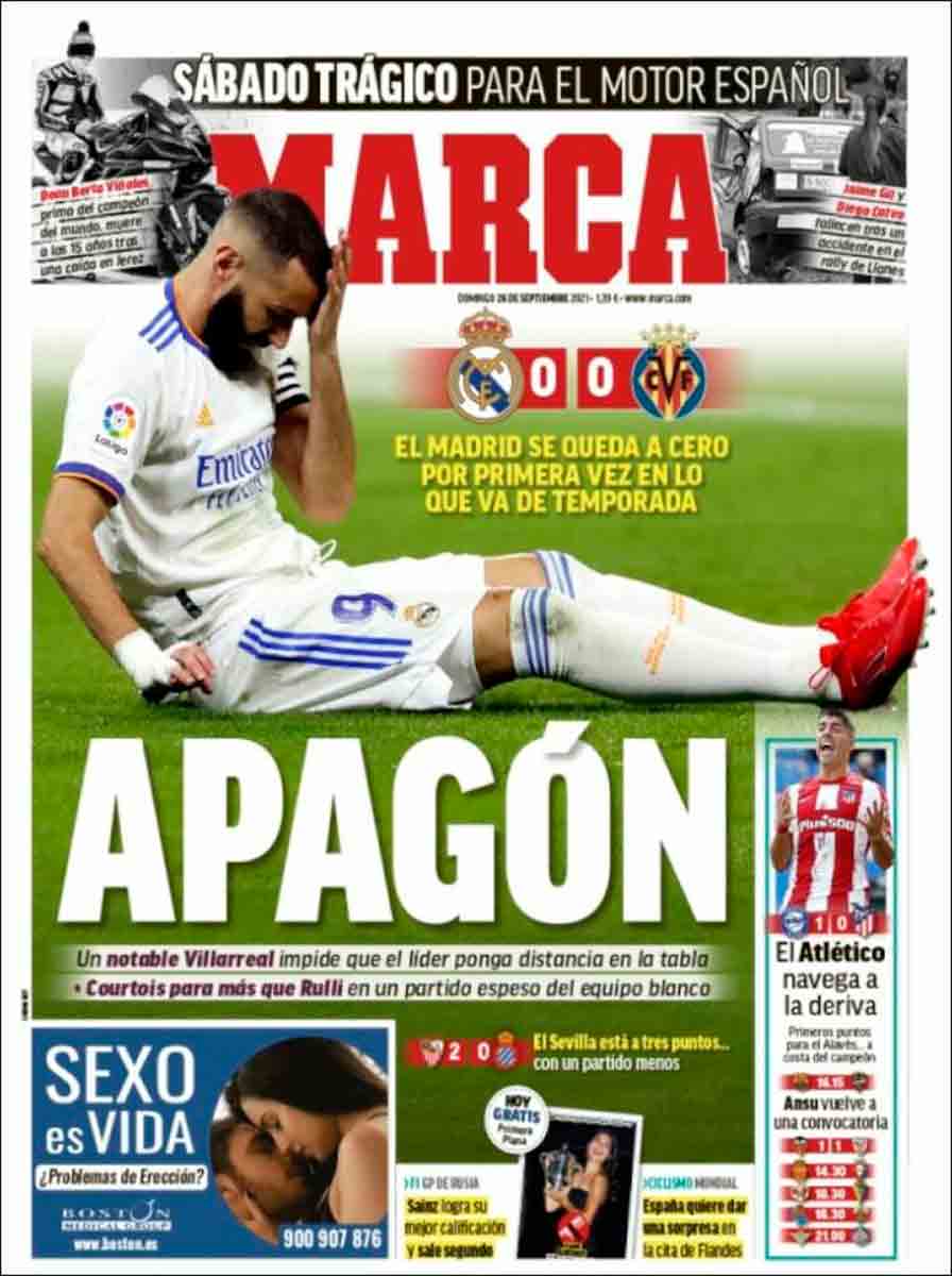 De ahí el apagón que destaca Marca, señalando con pertinencia la novedad de que el Madrid no marcase ni un solo gol tras haber empezado anotando tantos en los partidos previos. Se agigantó Courtois (una vez más) y no hubo demasiadas ocasiones blancas que hoy lamentemos haber fallado. Por eso Benzema aparece sentado en la portada, cabizbajo y algo afectado, tal vez porque no lo vimos bailar como suele.
