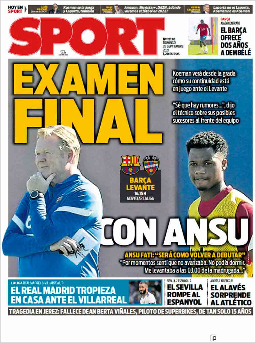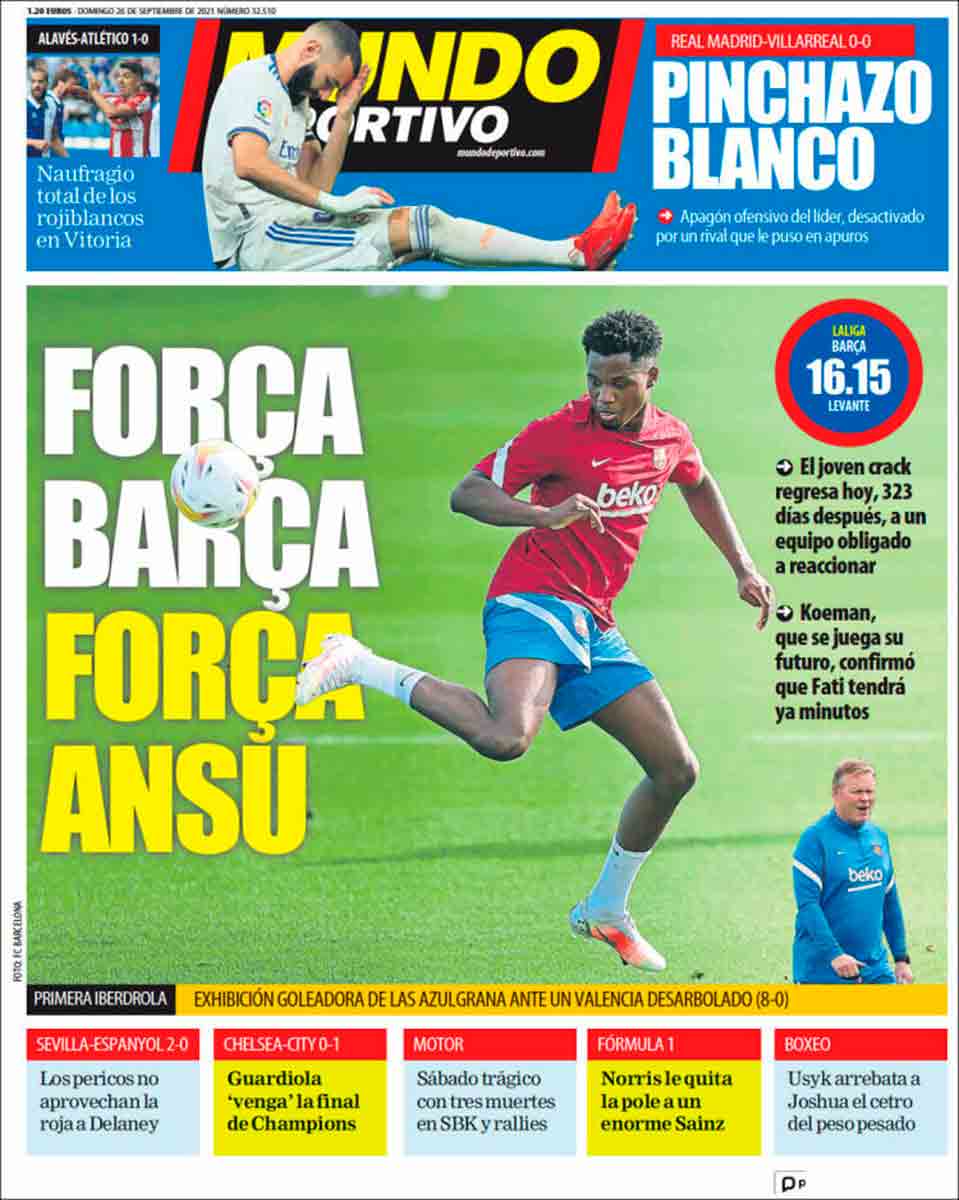 Suponemos que, ya que estamos, toca poner el resto de portadas del día, aquellas que se refieren a cómo en Can Barça renuevan su ilusión cada diez minutos porque en realidad no saben lo que les pasa. Tranquilos, si la cosa no se resuelve con Ansu Fati, lo hará en un futuro próximo con Pogba, Mbappé, Haaland, Van Basten, Platini y Garrincha. Todo es posible en su mundo de color. Es solo cuestión de tener fe, que es gratis, no como las renovaciones de Messi.