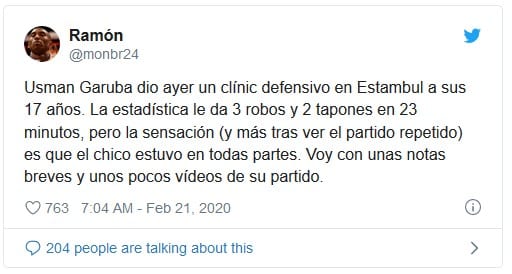 Hoy Usman Garuba cumple los 18 años en uno de los mejores momentos de su cortísima carrera profesional, aprovechando muy bien los minutos que han dejado las ausencias de Randolph y Mickey. En los últimos 6 partidos (4 de EL y 2 de ACB) Usman promedia 5'5 puntos (12 de 17 en tiros de 2, 2 de 8 en triples, 3 de 7 en libres), 6'3 rebotes, 1'2 asistencias, 1'5 robos, 1'2 tapones, 0'8 pérdidas para 11 de valoración y un acumulado de +70 con él en pista en 22 minutos por partido. Nada mal para un junior, sobre todo tratándose de un jugador cuyo máximo valor radica en todo lo que hace y no aparece en la hoja de estadísticas, como intenté recalcar en este hilo de twitter sobre su exhibición defensiva ante el Fenerbahçe: