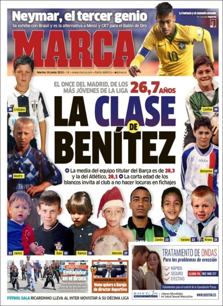 Nos gusta ver a nuestros ídolos cuando eran niños, aunque sea con la excusa algo traída por los pelos de la favorable media de edad de la plantilla del Madrid. El fútbol es para nosotros, los aficionados, una recuperación episódica de esa ingenuidad infantil que nos hace vibrar con cosas que objetivamente no importan, y el ver a nuestros jugadores retratados cuando eran unos mocosos nos hace albergar la esperanza subliminal de que ellos lo vivan como nosotros, la esperanza inconsciente de que necesiten ver ganar al Madrid con el mismo impulso pueril, la fe preadolescente en algo casi imposible: que el perder, para ellos, sea tan inaceptable como lo es para la afición, algo que solo se puede creer desde esa misma inocencia infantil. Por eso, para hacernos esa vana ilusión, cifrada en el subconsciente, nos gusta verles como los niños que fueron, aunque la portada de Marca habría tenido mucha más gracia si no salieran los nombres de los jugadores, permitiendo al lector el pasatiempos de adivinarlos.