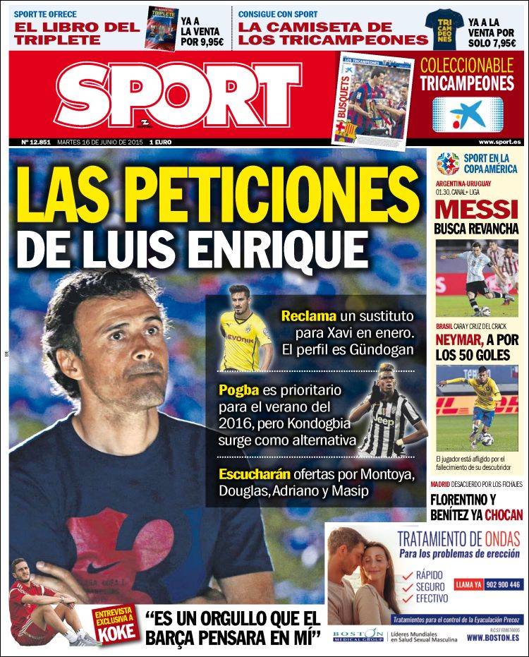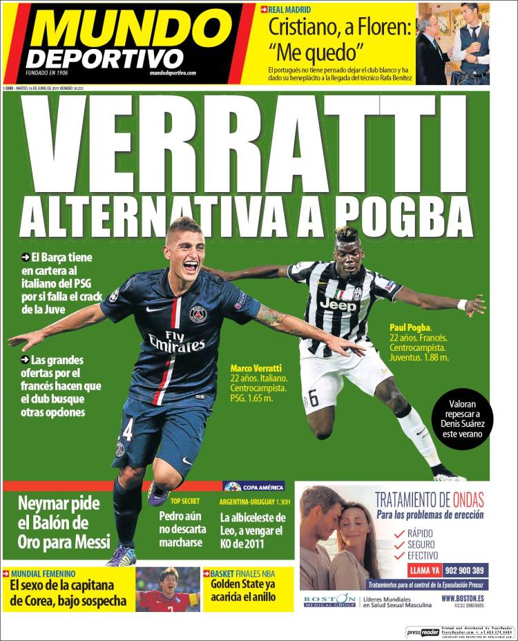 ¿Peppeppeppero no había dicho Sport -hace apenas dos días- que Pogba esta cerquísima? Vamos, casi un hecho... Y ahora resulta que no, que para verano de 2016, si eso. Que Verrati, no sea que se lo lleve el Real Madrid; que si tal, que si cual. Vaya faena le está haciendo MD a Sport.