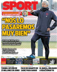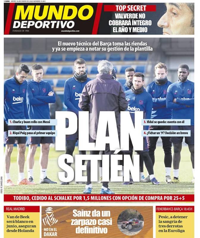 Mundo Deportivo trae a portada el primer entrenamiento dirigido por Su Eminencia, “el mejor entrenador de España” según un periodista con claustrofobia. Dice Mundo Deportivo que ya se nota un cambio. No se percibe dicho cambio, o al menos no un cambio para bien, en el careto entre adormilado y perplejo que tienen los jugadores al escucharle, pero Mundo Deportivo deja este mensaje de optimismo para ver si, sumado este mérito a su (también) silencio respecto al indigno despido de Valverde, consiguen otra entrevista con Bartomeu.