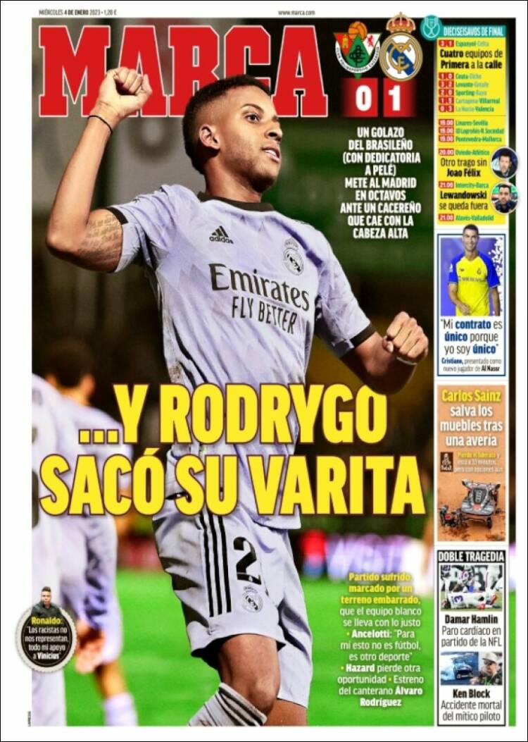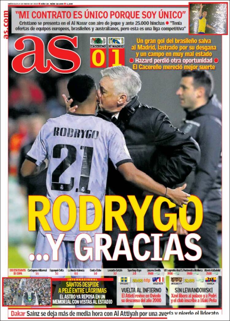 Marca es hoy menos ceñudo con el Madrid, y prefiere con buen criterio poner el acento en la perfecta maniobra de Rodrygo, única flor en un terreno baldío. Hubo en efecto “dedicatoria a Pelé” tras el gran tanto, como era de ley y de un modo que nos emocionó. Marca se hace eco además de las palabras de Ancelotti al término del choque en Cáceres: “Para mí esto no es fútbol, es otro deporte”, en alusión a lo imposible del terreno de juego. El Madrid lo jugó (ese otro deporte) como buenamente pudo, y logró su objetivo. Cabe argüir que Ancelotti debió haber planteado un once más físico de entrada, conocedor como sin duda fue a priori del estado del terreno de juego. Es opinable. Al menos el partido se cerró sin lesiones, lo que ya es mucho (lo de Odriozola no parece gran cosa).