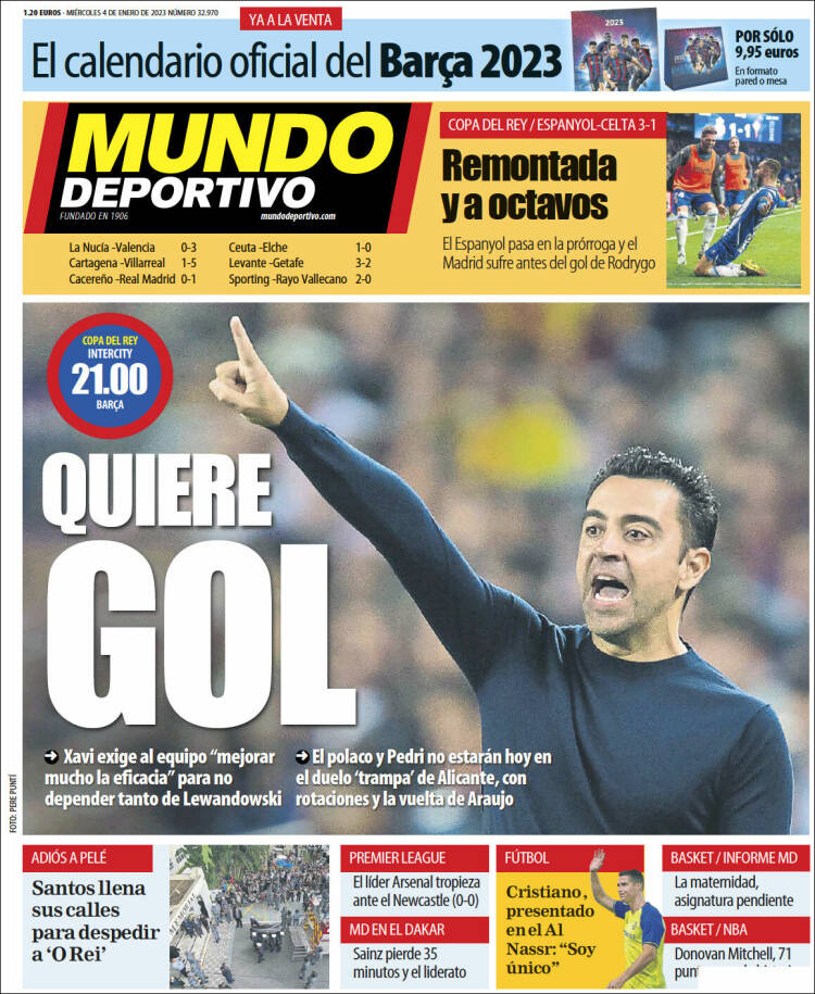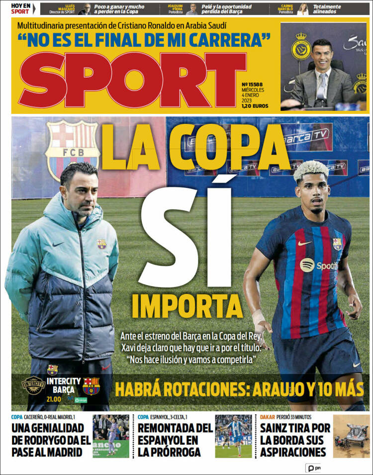 Concluimos con Sport, que es quizá, curiosamente, el diario que decida hoy más tiempo a la chocante presentación de Cristiano Ronaldo, allá en tierras desérticas, como nuevo futbolista del Al Nassr. Da rabia (rabia saudí) verle acabar sus días en un fútbol sin horizontes deportivos y sin más aliciente que el dinero, sobre todo cuando él mismo afirmó -y le creíamos, porque su ejemplar carrera invitaba a ello- que no era el vil metal lo que condicionaba su existencia. También dio rabia verlo entrenar en Valdebebas, en esa especie de indirecta tragicómica, agridulce, por estar de vuelta. Dice Cris en la portada de Sport que no es el final de su carrera. Nos gustaría pensar que es así, y que el año próximo podemos verle jugar (esta vez sí) sus últimos años en otro club europeo de cierta talla.