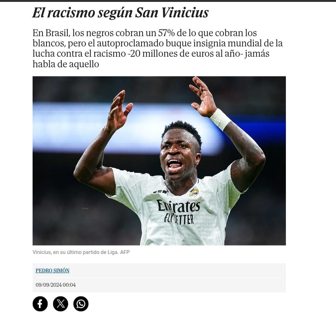 A continuación, siguen una serie de apuntes demagógicos que tratan de hacer pasar a Vinícius como culpable de la pobreza en su país, rematando la sucesión de absurdeces con una alusión al sueldo del jugador. Se conoce que, como el delantero cobra un sueldo que provoca la envidia sarracena de Simón, no tiene derecho a quejarse por el racismo que sufren en sus carnes él y otros jugadores negros (este fin de semana, en Gijón y en Elda sin ir más lejos). Como Vinícius no dona la integridad de su sueldo (y qué sabrá Simón de lo que dona Vinícius) a la lucha contra la pobreza en Brasil, no tiene derecho a denunciar el racismo en los estadios de España, racismo del que ha sido indudable víctima aunque el autor de esta bazofia ¿lo niegue? ¿lo obvie? ¿lo defienda?