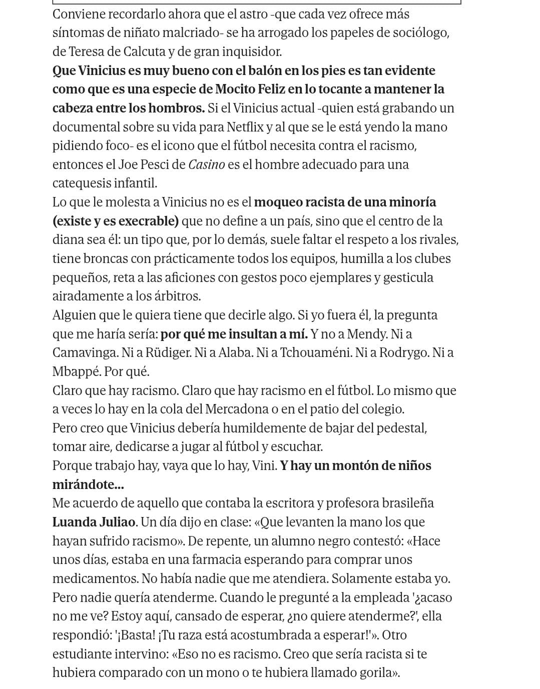 Resumimos, pues, el artículo de este racista ignorante (o no) de su propia condición: Vinícius no tiene derecho a quejarse porque le llamen mono o negro de mierda porque no ha arreglado el hambre en Brasil y porque a Bellingham, en cambio, no le llaman mono.