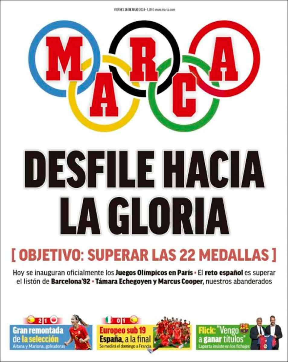 El diario madrileño se siente como pez en el agua con estas portadas pretendidamente elevadas con aspiraciones globales que en el fondo tienen menos sustancia que una sopa de agua destilada vegana. Han colocado una letra de su cabecera en cada anillo olímpico y un titular pomposo: «Desfile hacia la gloria». Y p’adelante.