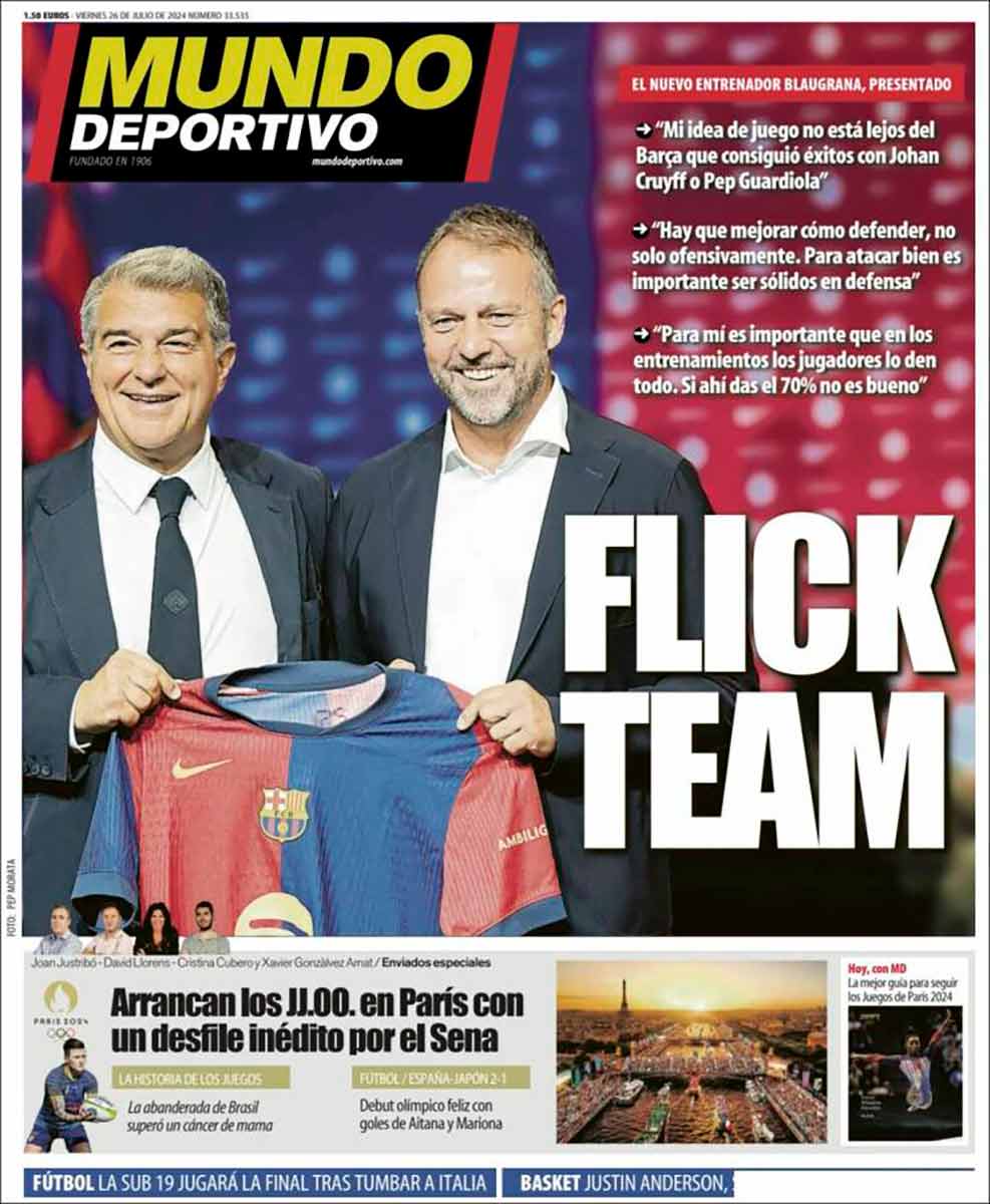 Los dos principales periódicos deportivos catalanes llevan en su tapa a Laporta y Flick. Ayer presentaron al nuevo técnico y, debido a que son como una secta, sea cual sea su discurso ha de incluir el aditamento de alguno de sus santos laicos, para no escandalizar a sus feligreses.