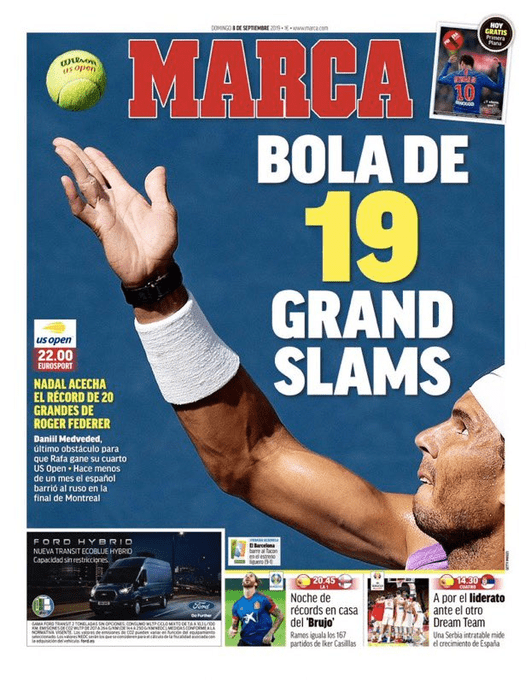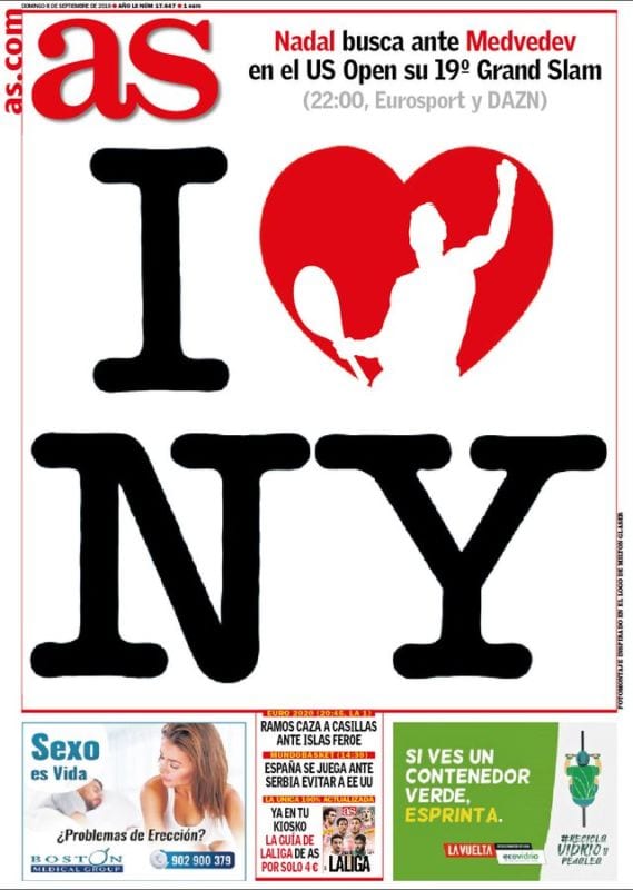 Para finalizar, una dosis de Rafa Nadal, que disputará la final del US Open en busca de un nuevo Gran Slam con el que seguir retando a la historia. Preciosa portada de 'La Ouija Today', a la que debemos felicitar con la misma energía que otras veces usamos para realizar una crítica. Hoy están a la altura de las circunstancias. Será porque el Real Madrid no tiene nada que ver o porque la grandeza de Nadal no permite medias tintas, pero al César lo que es del César.
