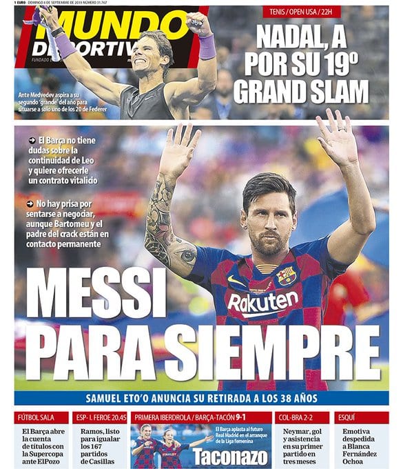 Buenos días. Amanecemos hoy con una de esas portadas que nos recuerdan lo culé que es Leo Messi y el amor que siente por el Barcelona. Es tan culé y está tan enamorado que lo mismo renueva por enésima vez para demostrárselo a la familia blaugrana.