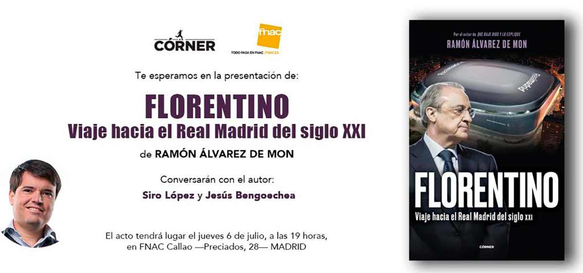 El próximo jueves 6 de julio, en la madrileña Fnac de Callao, estaré junto a Siro López y el propio autor presentando “Florentino”, el nuevo libro de mi amigo y socio galernauta Ramón Álvarez de Mon. Ya fui honrado colaborando en la presentación (y escribiendo el prólogo) de su primera incursión literaria cuando publicó —con el mismo sello que ahora: Córner— su excelente “Que baje Dios y lo explique”, un recuento de las hazañas europeas del Madrid de Ancelotti que fructificaron en el logro de la Catorce.