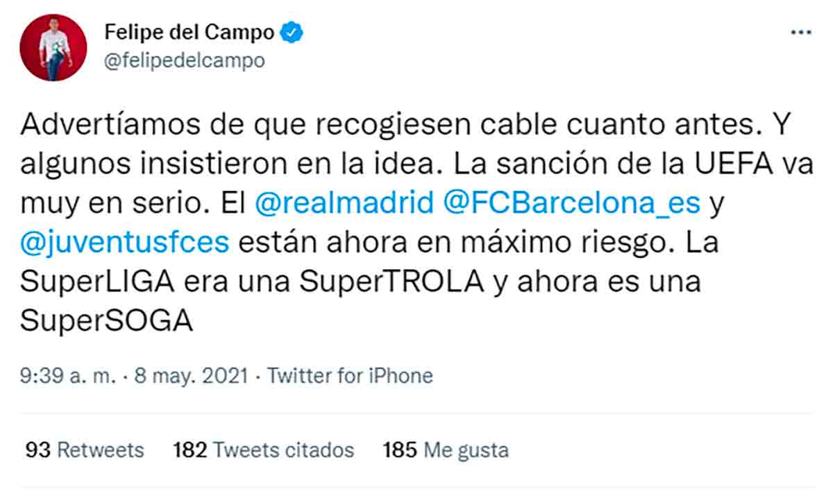 Otro ejemplo de la indecencia de este medio. Hoy toda la prensa se hace eco de que la UEFA ha anulado los expedientes a R.Madrid, Barça y Juve por el tema de la Superliga (hecho real) . Sin embargo este panfleto titula la noticia con la supuesta intención de recusar al Juez por parte de Ceferin/Uefa (hecho futuro a confirmar).