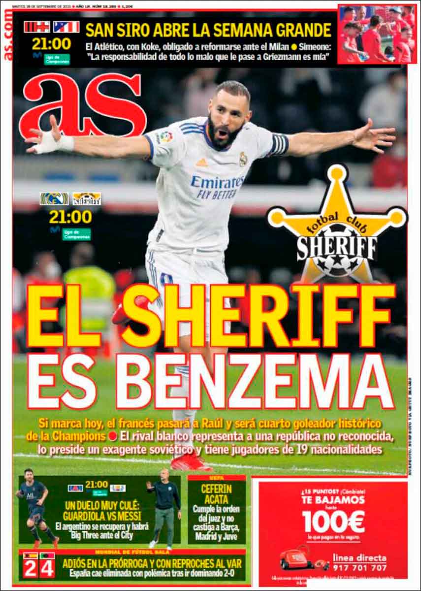 En As los tiros van por el mismo sitio, dedican su frontispicio al Sheriff Benzema, que está a un gol de Superar al mismísimo Raúl González Blanco como cuarto máximo goleador en la Champions. Casi nada, y eso que no era un goleador. Pero tranquilos, habrá alguno que discuta hasta las matemáticas.