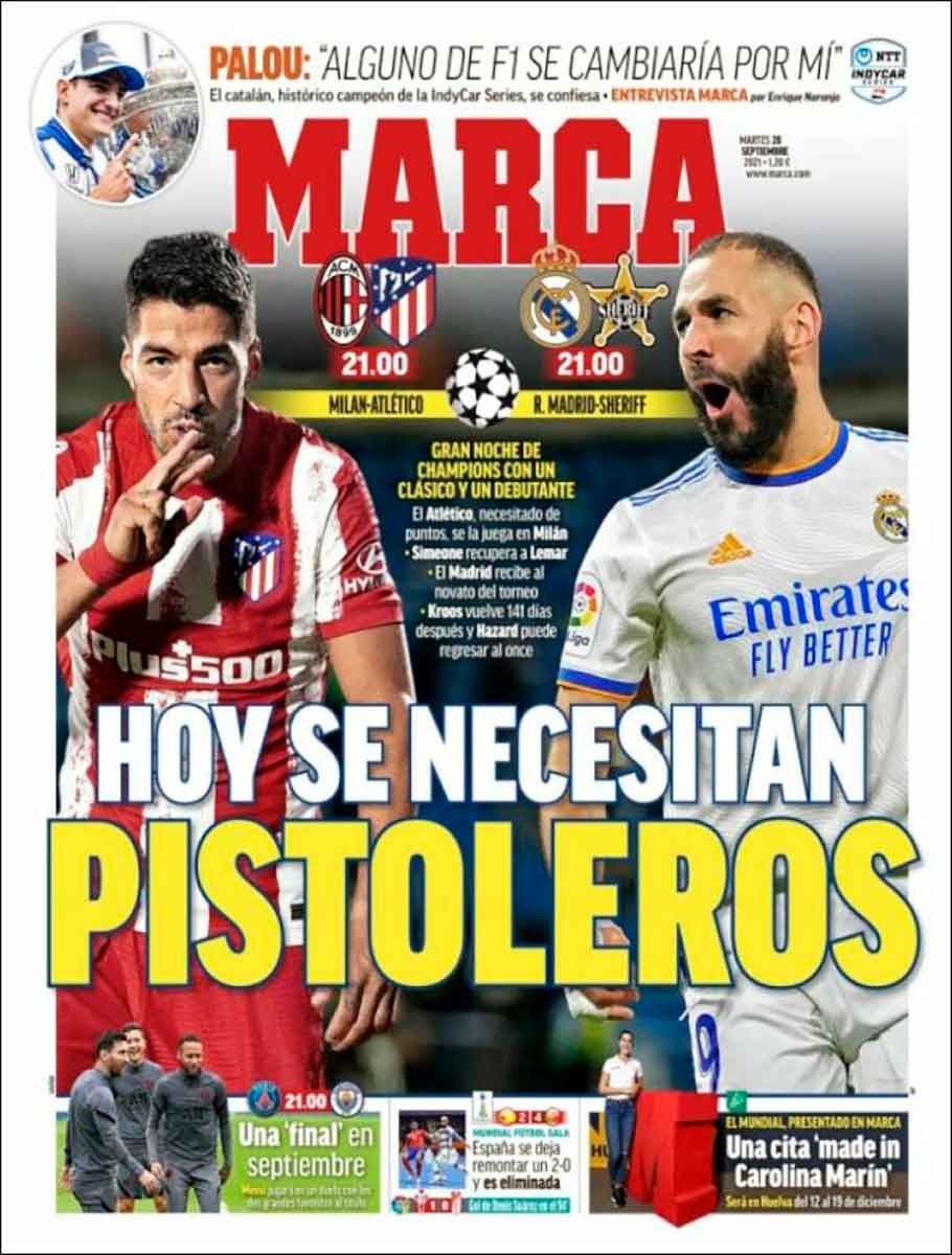 ¿Y qué ofrecen las portadas si no se hacen (prácticamente) eco de la noticia de la recogida de cable (esta vez sí real) de Ceferino? Pues debido a que el Madrid se enfrenta esta noche al Sheriff en Champions, Marca lleva a su primera plana a los pistoleros Luis Suárez y Karim Benzema.