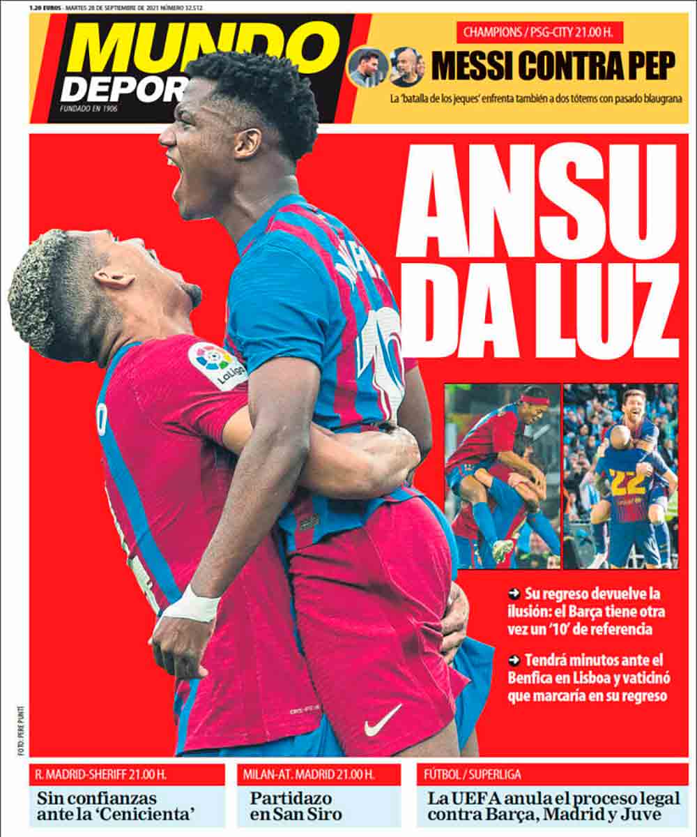 En Mundo Deportivo siguen con las meninges sobreexcitadas y comparan hoy (gráficamente) a Ansu Fati con Ronaldinho y Messi. Además, le cambian el nombre y lo convierten en portugués: Ansu Da Luz. Bueno, pues nada, seguid a lo vuestro.