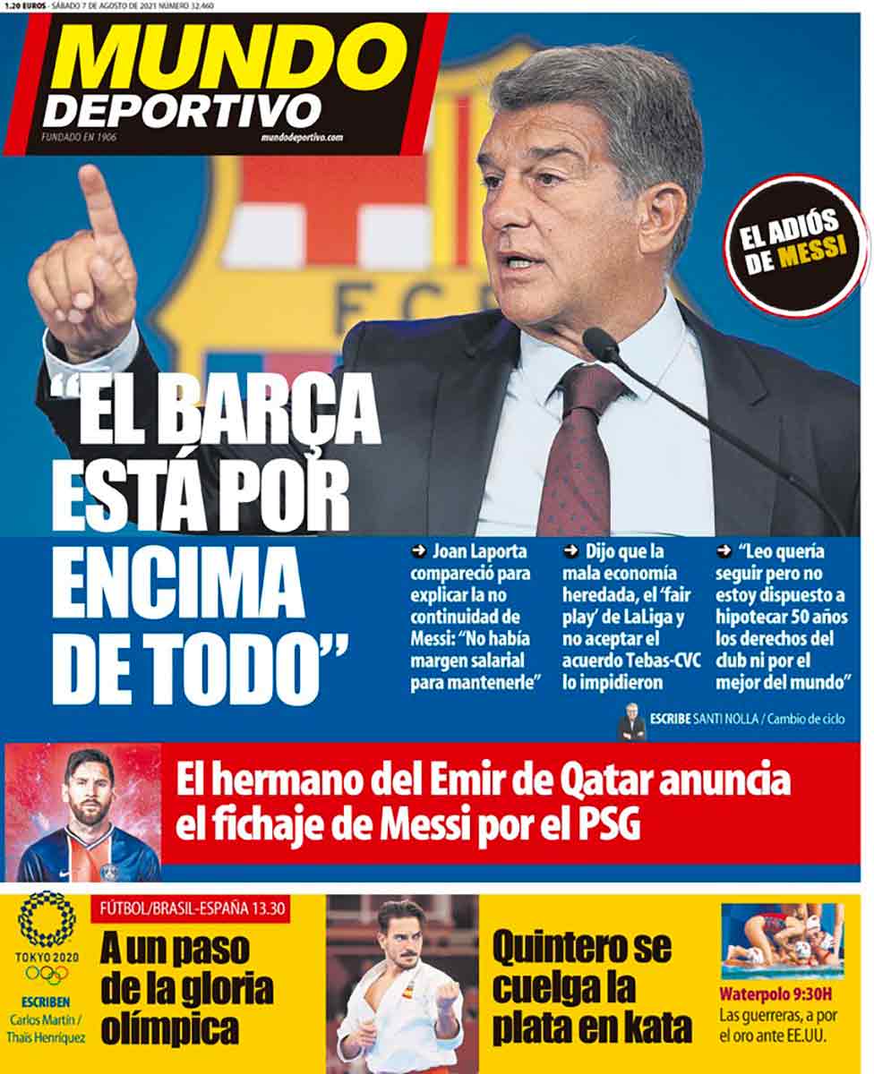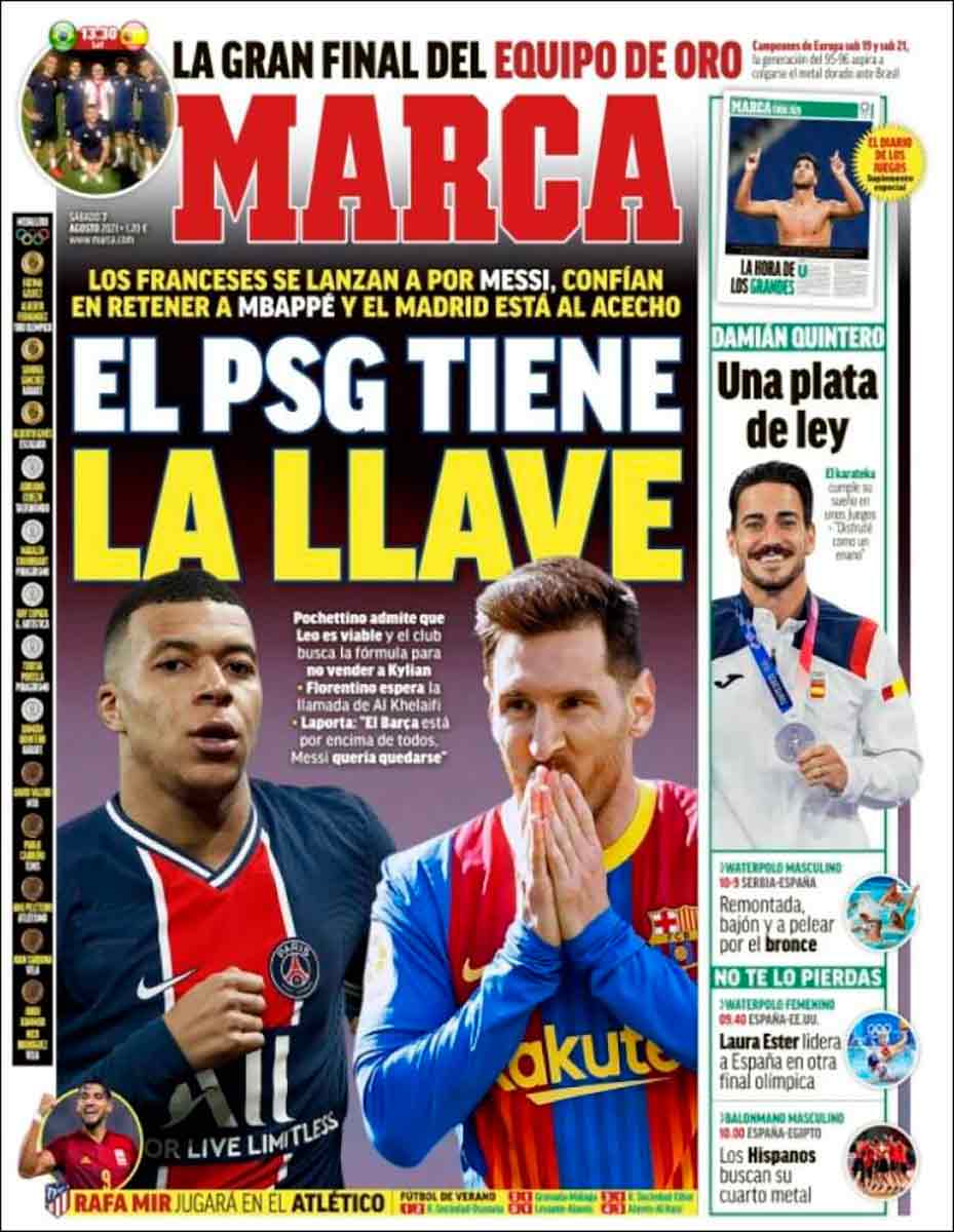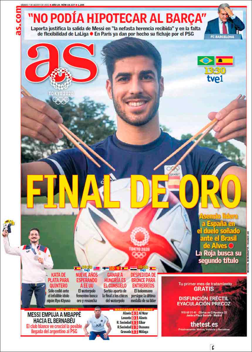 Marca ahonda en esta idea y As sí lleva a su portada un asunto del día (porque lo de Messi era esperado hace mucho), la final olímpica de fútbol entre Brasil y España, que se disputa hoy a las 13:30 horas. Con Marco Asensio en su portada, pese a que la selección está en la final gracias a que Pedri pidió el cambio en la semifinal, entró Marco y marcó el gol de la victoria.