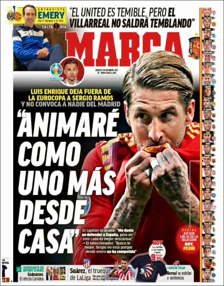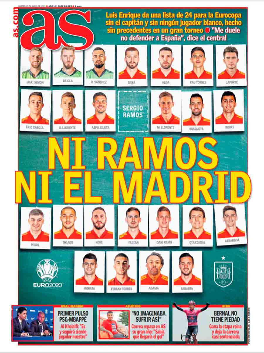 Buenos días, queridos galernautas. «Ni Ramos ni el Madrid» titula As. Este es el resumen de la convocatoria de ayer de Luis Enrique para la Eurocopa 2021. La noticia llegó en el séptimo aniversario de la Décima, en el séptimo aniversario del gol de Ramos que todo madridista guarda en un podio de su memoria junto al de Mijatovic de la Séptima. Por primera vez no es convocado ningún futbolista del Real Madrid para la fase final de un torneo como la Eurocopa.
