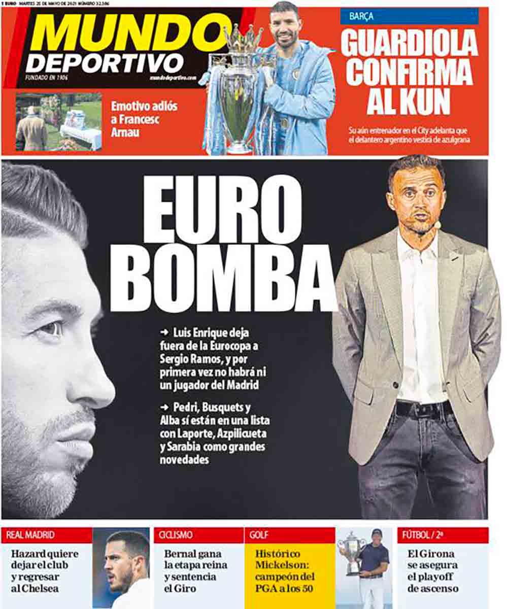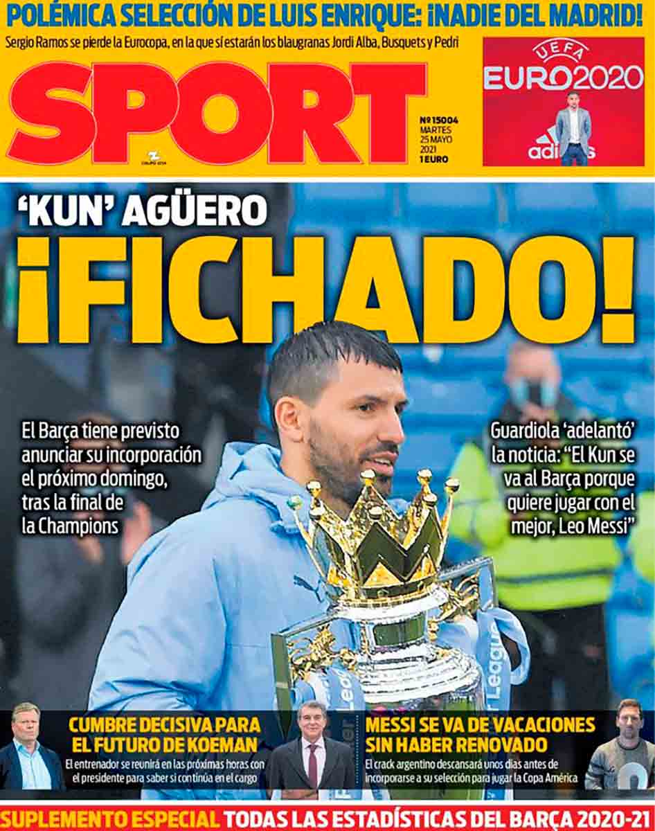 Os dejamos con el resto de portadas. Nada nuevo bajo el sol. Mundo Deportivo dedica su habitual tono de luto cuando las noticias afectan al Madrid para llevar a su portada la ausencia de Ramos. Sport lleva en su frontispicio a un Agüero que pareciera estar bajo un aguacero y Guardiola dice (en el aguacero de lágrimas en el que se despidió del Kun) que su pupilo se va al Barça para jugar con Messi, por lo que, según él, Leo renovará con el Barcelona.