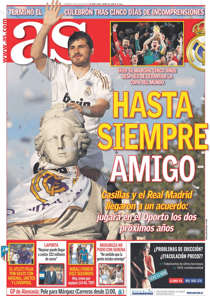 Sí. Como recuerda As, casi a la misma hora que el Real Madrid emitía su elogioso COMUNICADO, levantaba Casillas la Copa del Mundo hace cinco años. Siempre quiso As tratar al portero del Madrid más como el yerno ideal de España que precisamente como el portero del Madrid, dando por descontado que lo primero era una categoría tan virtuosa y abarcante, que se bastaba para que, por prescripción facultativa, fuera Iker titular sine die en el Madrid. Se equivocaba As mezclando churras y merinas, pero nos atrevemos a decir que más que error era capciosidad, pues conseguía con semejante estratagema violentar hasta donde fuera posible la paz social del madridismo. Haciendo suyo el histórico monólogo de Harry Lime en El tercer hombre, Relaño (y por supuesto no solo Relaño) asumió hace ya tiempo que esa paz no es productiva, que ella no contribuye a vender periódicos, que la burda lógica nada matizada del amigo-enemigo da de comer aunque deje desnutrido el rigor y, sobre todo, la inteligencia. Siendo así, no es nada extraño que el titular de As despida a Casillas llamándole amigo, y no tendríamos nada en contra de adiós tan emotivo si no se hubiera forjado a base de haber creado, paralelamente, un enemigo, llámese José Mourinho, Diego López o Florentino Pérez. Iker se va (y deseamos que le vaya bonito), pero As se queda y no creemos plausible que a estas alturas abandone esta pueril táctica perversa. Aquí nos quedamos también nosotros para comprobarlo o -no nos duelen prendas- ser desmentidos.