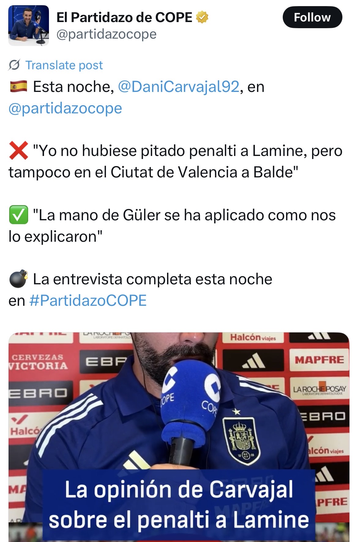 Que queréis que diga Carvajal?? Ha opinado que no fue penalti a Lamine. Va a la selección española y juega para nuestro país, que pasa que esto está mal?? Respeto a quien no quiera que gane la selección, pero yo no opino igual.
