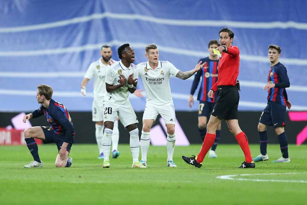 Fue el preludio de un Madrid vigoroso, preciso, victorioso en el juego de presiones propuesto por el jardinero de la democracia catarí. Abrumados por la hostilidad —no están acostumbrados— y superados por la puesta en escena del Real, cuatro minutos tardó Ronald Araujo en soltar dos tarascadas de amarilla, primero a Nacho y luego a Vini. No vio ninguna. Lo cierto es que el primer tiempo condensó en 45 minutos todo aquel teatro del bueno que denunciaba el bueno de Mourinho en el londinense barrio de Chelsea. Raphinha sufrió una falta normal con tres vueltas de campana y un triple Axel, Busi tendría un vahído y Gavi —¡Gavi!— también se desplomaría fulminado por el Espíritu Santo. Munuera Montero, al parecer, podría estar comprobando entonces el Bizum. Mami, que será lo que tiene Negreira.