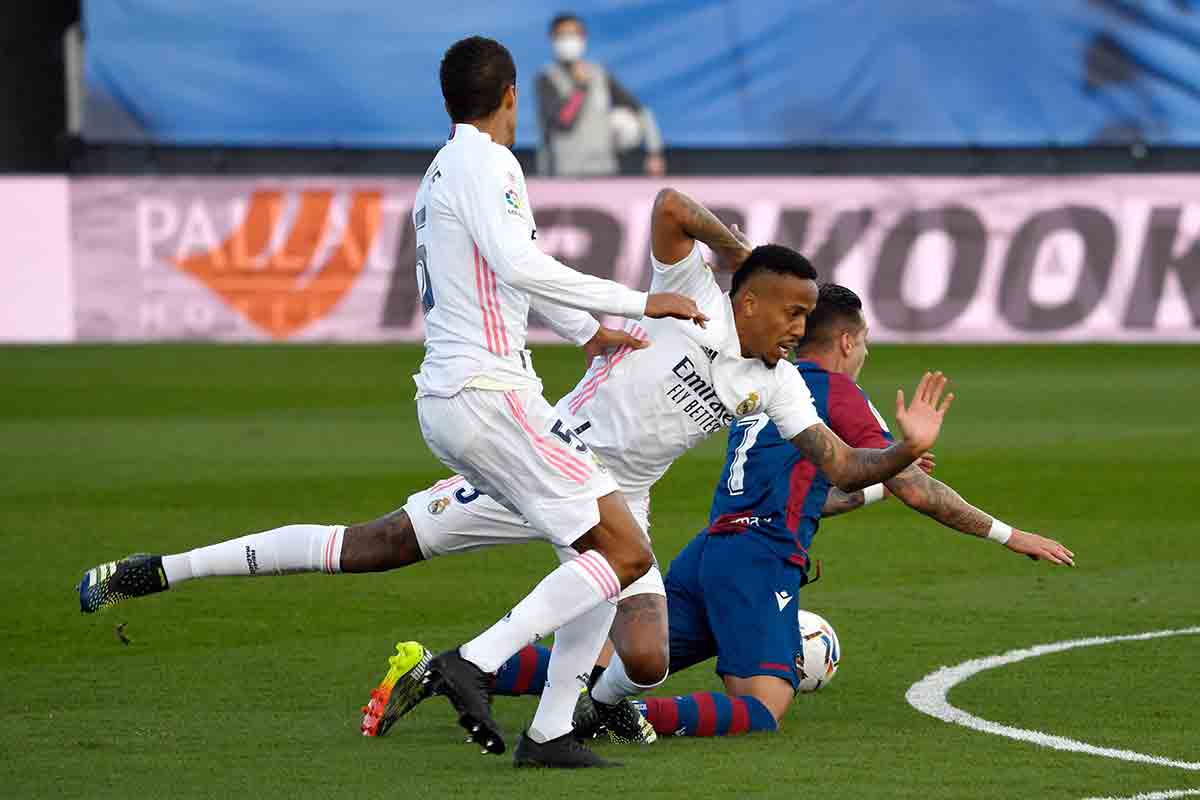En una de las múltiples repeticiones de la jugada de la expulsión, se aprecia claramente que Militao ni siquiera roza al levantinista. Justamente, volvieron a repetir varias veces tomas desde varios ángulos excepto ésa.