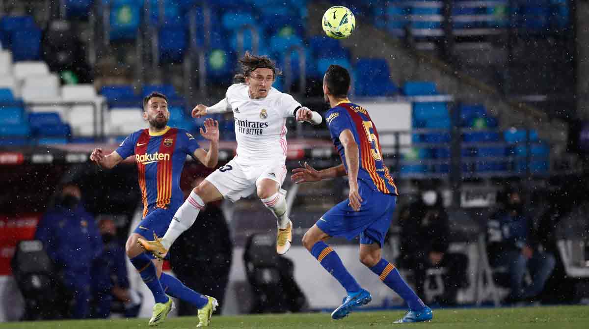 El partido comenzó con dominio de balón del Barcelona, que buscaba los costados de Casemiro para activar a Messi y desde ahí girar al Madrid. El conjunto madridista no encontraba una salida fácil del balón y no parecía estar cómodo. Sin embargo, es una gran arrancada de Valverde, el balón le llegó en la banda derecha a Lucas que buscó un centro raso y tenso al primer palo para un Benzema que de tacón genial sorprendió a Ter Stegen. Golazo que adelantaba al Madrid en el minuto 14.