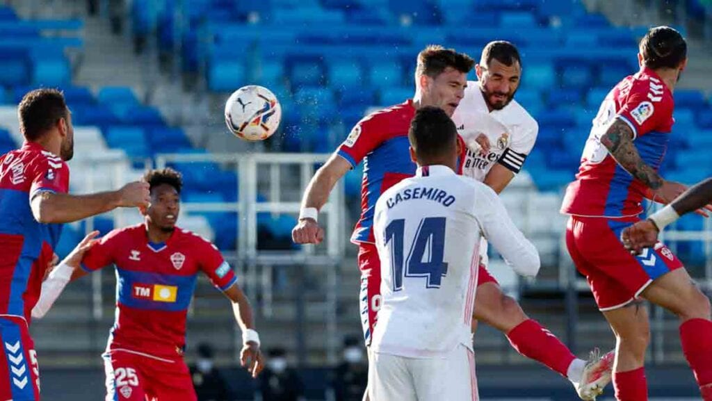 Salió con más intención el Real Madrid en la segunda parte. Sin ningún tipo de brillantez, pero más empuje comenzó a acercarse a la portería ilicitana. El primero en apuntarse una ocasión fue Benzema con un control orientado y disparo de primeras que se marchó por poco. En el 53 Ramos sufrió un agarrón claro en el área, pero el árbitro interpretó falta en ataque y el VAR no le corrigió. Fue un escándalo.