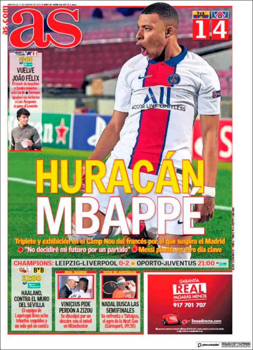 “Huracán Mbappé”, enfatiza As, comprensiblemente extasiado ante el hat trick y la exhibición de juego del Lagarto. El partido dejó la inevitable (y errónea) lectura de la entrega del testigo como mejor jugador del planeta de Messi a Mbappé. No. Mbappé no relevó ayer a Messi como mejor jugador del mundo, por la sencilla razón de que hace tiempo que Messi dejó de ser el mejor, condición que en todo caso compartía con Cristiano. El supuesto mejor jugador del mundo no hace el ridículo en la Champions, la competición verdaderamente importante, un año y otro y otro y otro y otro y otro. Eso le pasa al mejor jugador del mundo una vez. Si le pasa miles de veces (Lisboa, Liverpool, Roma, Turín...), igual es que no es el mejor jugador del mundo por muchos golazos que le meta el Leganés o al Huesca en un campeonato doméstico progresivamente desacreditado por el propio Tinglao que lo organiza.