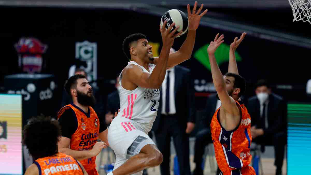 El segundo cuarto empezó más espeso, ya con las rotaciones, y en particular por la parsimonia en ataque de Nico Laprovittola, recién superada su baja por el Covid-19. Causeur, Abalde y Thompkins, más unos triples finales de Llull y Rudy sirvieron para mantener una cómoda diferencia al descanso, 49-34. A destacar que el Valencia dispuso de 16 tiros libres (de los que convirtió 15), gracias al continuo martilleo de Hierrezuelo sobre los pivots blancos. Esos tiros mantuvieron semivivos a los valencianos, que tan solo fueron capaces de anotar un triple.