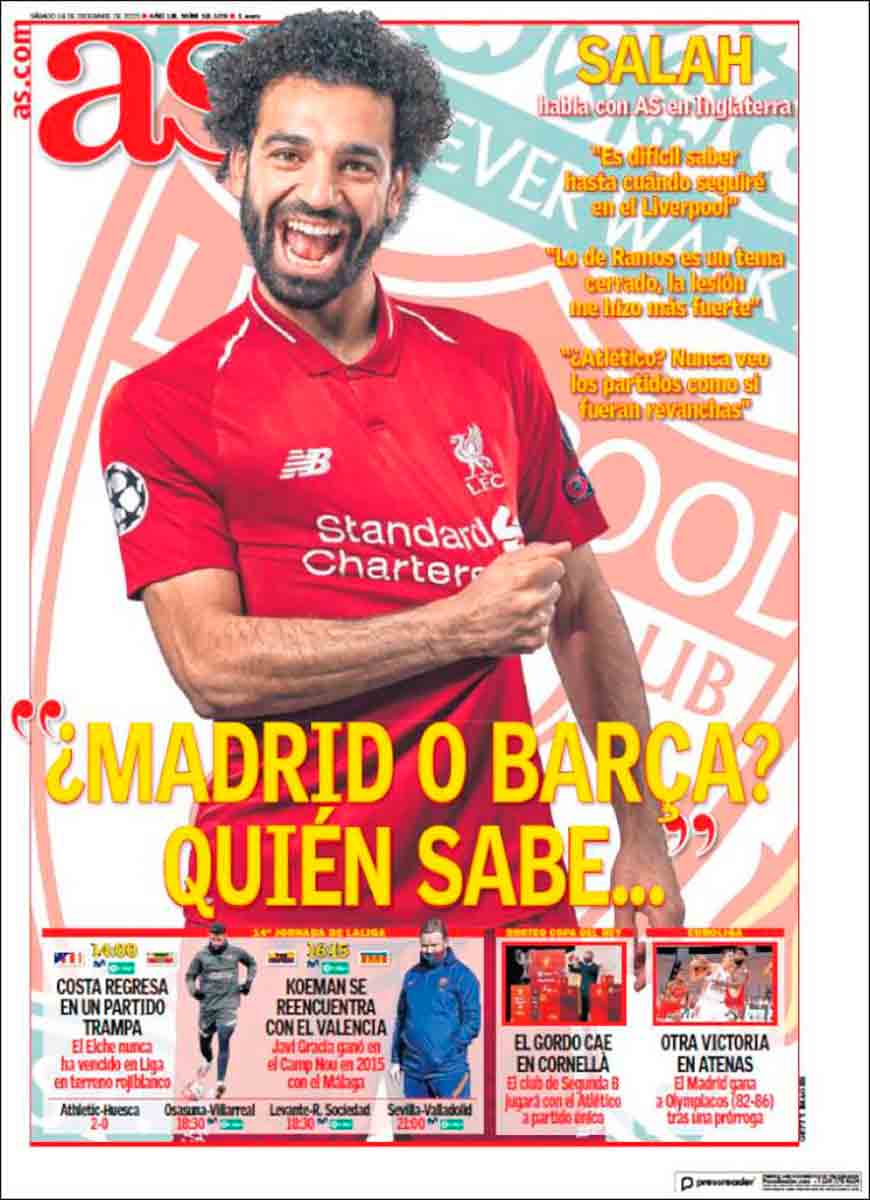 Buenos días. Hoy se hace historia del fútbol con el primer Real Madrid- Atlético de Madrid femenino de siempre y Marca le dedica su portada. Cuando se recuerde este momento, sólo el diario madrileño aparecerá como guardián de la fecha en la que As no ha debido caer. En lugar del derbi está Salah en una foto como de magacín. As convertido en un magacín y Salah en un actor como de Vacaciones en el mar. Casi se puede oír hasta la sintonía mientras el egipcio se hace el interesante. ¿Es interesante Mohamed para el Madrid o para el Barça? Pues por qué no, pero tampoco estamos seguros. Eso es todo en el marcasismo. No somos capaces de exprimirlos hoy con mayor fortuna. Menos mal que tenemos los diarios cataculés, esos paraísos para el portanalismo donde siempre hace buen tiempo.