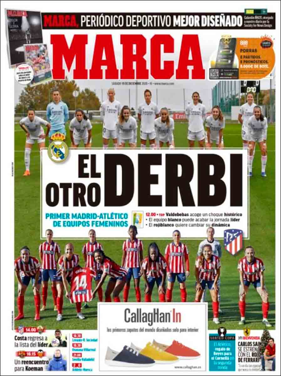No te alegres en exceso, portega, porque el marçaca haya llevado a su portada de hoy el primer derby madrileño del fútbol femenino, si a nuestras chicas, que son buenísimas y juegan al fútbol de maravilla, se les ocurre ganarlo, el fútbol femenino desaparecerá mañana del marçaca como desaparecieron las crónicas de las dos victorias madridistas en Atenas en la Euroliga de baloncesto.