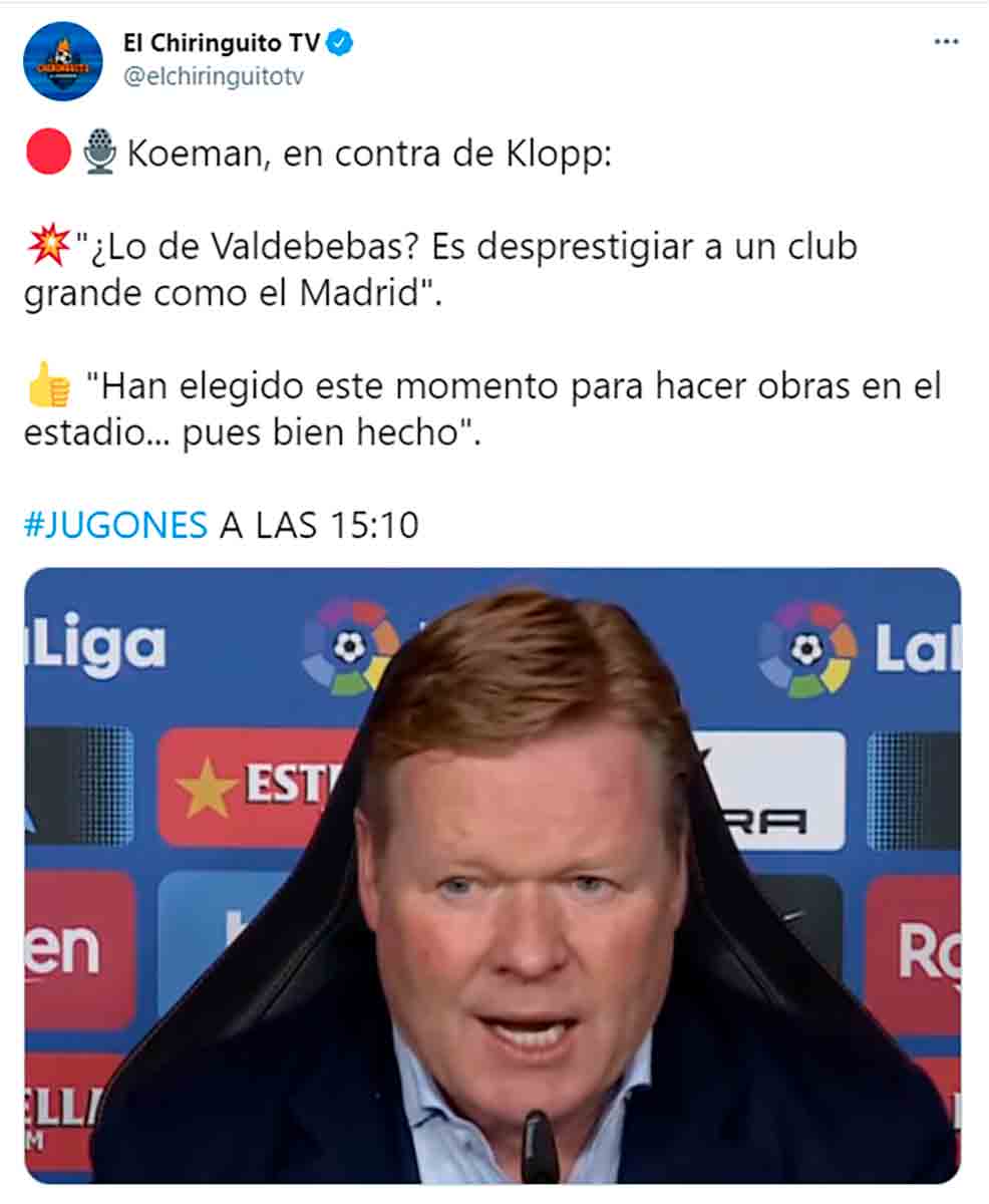 Sabemos que algunos como Klopp no piensan igual, peor para ellos. Jesús Bengoechea respondió como merecía al entrenador del Liverpool en nuestro canal de YouTube. Incluso Koeman afeó las palabras de Klopp y no se le cayeron los anillos en reconocer la acertada decisión del Real Madrid para elegir hacer las obras del nuevo estadio en este momento.