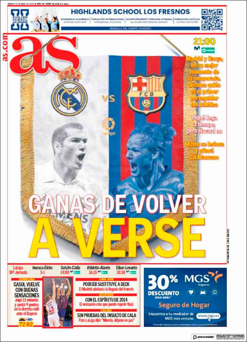 La portada de As apela al mismo espíritu de la misma frase del cartel de Laporta, pero adolece de la brillantez mostrada en Marca. “Ganas de volver a verse” puede leerse sobre un fotomontaje del clásico banderín con flecos que se intercambian (o se intercambiaban) los equipos antes de inicio de un choque. Dentro del mismo vemos las imágenes de Zidane y de una señora de Vitoria con moño que parece llamarse Miren por la expresión de su cara. Da la sensación de que esta señora está gritando: “Antxon, ¡¿otra vez vuelves de la sociedad cargado?!”. Un trago de café después comprobamos que estamos equivocados y que la señora de Vitoria con moño que parece llamarse Miren por la expresión de la cara no es tal, sino Ronald Koeman.