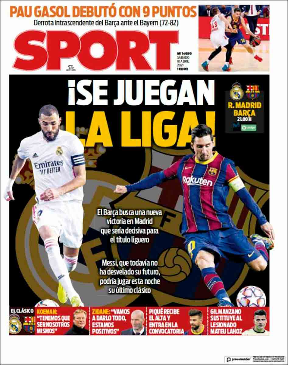 Sport repite en su portada a los protagonistas (Benzema y Messi) que también eligió Marca. Pero lo que más llama la atención es la parte superior. Resaltan que debutó Pau Gasol con el Barcelona de baloncesto, hecho del cual nos alegramos muchos madridistas porque admiramos a Pau como deportista y como persona, pero indican: “Derrota Intrascendente del Barça ante el Bayern (72-82)”. Vamos a ver, intrascendente no define como merece a esa derrota. El Barcelona no compitió, hay que decirlo claro. Y no compitió por miedo a un Real Madrid de baloncesto esquilmado que ha sufrido aún más infortunios que el de fútbol. Es un hecho deleznable la falta de respeto que ha mostrado el Barcelona por la competición, convirtiendo el partido contra el Bayern en una pantomima.