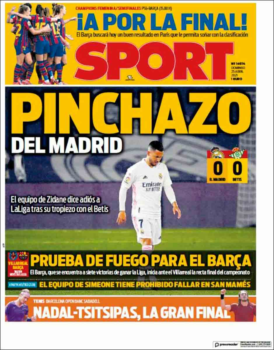 La palabra “pinchazo” que estaba en la portada del Marca aparece también en el Mundo Deportivo y en Sport. Este último medio entierra a los nuestros antes de tiempo al afirmar rotundo que “el equipo de Zidane dice adiós a LaLiga”. Con todo lo sucedido hasta esta fecha nos parece un milagro seguir con vida, pero mientras a los nuestros les quede un halo de esperanza, un mínimo aliento, seguirán en la pelea.
