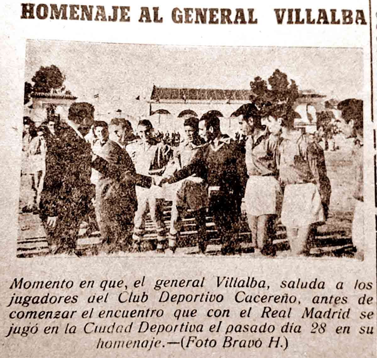 En la crónica de ‘MARCA’, con firma de Alfil, se destacó que “hubo gran entrada” y que antes del saque inicial “el gobernador civil impuso a don Fernando Turégano las insignias de oro del club, por reunir la doble condición de jugador fundador del club. La peña madridista de Valencia de Alcántara regaló al Cacereño una bandeja de plata, y lo mismo hizo con el Real Madrid. El saque de honor lo realizó la señorita Eloísa Trillo Figueroa, hija del gobernador civil y madrina del CD Cacereño en las festividad de sus Bodas de de Oro”. El partido tuvo color blanco que obtuvo la victoria por 1-3 con tantos de Fermín, Vidal y Vera. También actuaron, entre otros, Junquera, Babiloni, Miera, Toni Grande o Sánchez Barrios.
