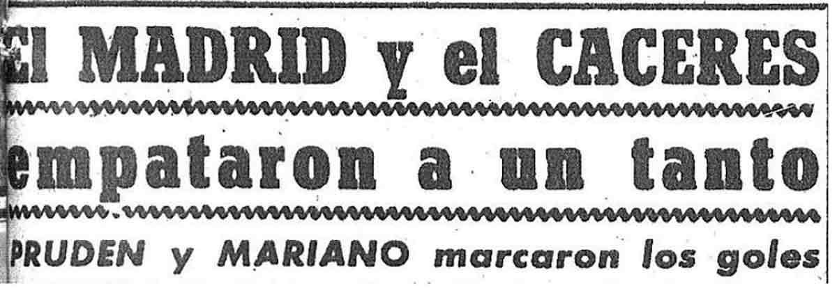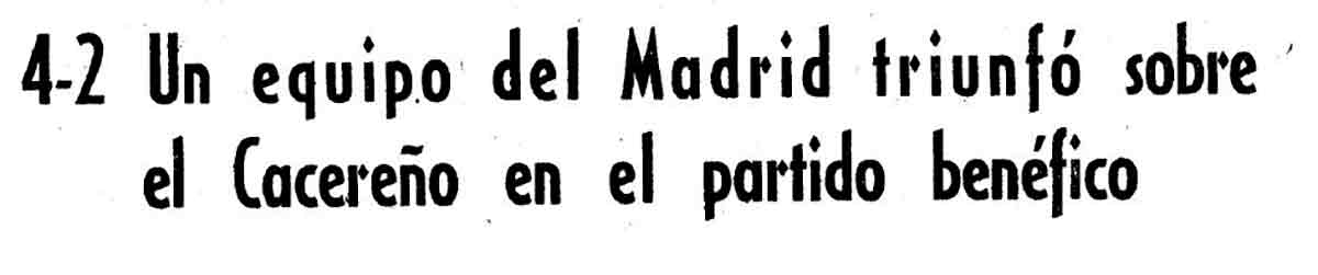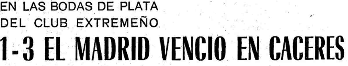 La crónica de MARCA del día 9 indicaba que se pudo ver en la primera mitad un “juego muy vistoso y de superior calidad por ambos conjuntos, a pesar del viento reinante, que restaba lucimiento en algunas jugadas”. El dominio fue alterno y “en general, el partido ha sido muy interesante, ya que se ha jugado con exquisita corrección por ambas partes, y a la superior técnica del Madrid, el Cacereño respondió con un juego rápido, entusiasta y de muy buena calidad”. El conjunto madridista se llevó la victoria por 1-4 con dos dianas de Molowny y una de Wilson y Joseíto. En la alineación también figuraron Berasaluce, Becerril, Oliva, Marsal o Castaño.