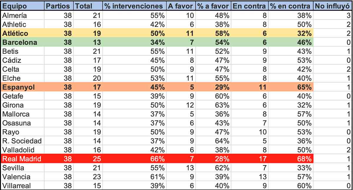 Si responden que sí a esta pregunta retórica, vayamos al siguiente dato extraído por Carlos García de Sola en su análisis. De las acciones en las cuales interviene el VAR y las modifica, el VAR rectifica a favor del FC Barcelona el 54 % de las veces, a favor del Atleti el 59 % —estamos esperando un comunicado de Gil Marín en la portada de Marca poniendo el grito en el cielo porque ese 59 % no sea un 100 %—, y con el Madrid rectifica a favor en un 28 % de las situaciones, el menor dato de todos los equipos de la liga.