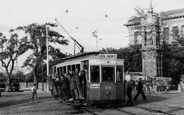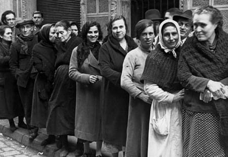 Vamos, pues, a viajar a Madrid, la ciudad donde los guardias multan con 10 pesetas a las parejas que encuentran besándose, y acaba de prohibirse el tango, un baile decadente. El alimento, racionado, solo puede comprarse con los cupones semanales de una cartilla de abastecimiento por familia, o se busca, a precios inasequibles para la mayoría, en el mercado negro; alguno se las apaña para criar gallinas en su piso, y mira, come huevos, en vez de puré de San Antonio, como dicen a la harina de almorta que salvará a tantos de morir de hambre, hasta que las autoridades la prohíban hacia mitad de la década, aunque desde el 40 se conociera que su consumo continuo causa una enfermedad neurotóxica. Ahora, para divertirse hay que llevar encima la chapa del Auxilio Social, que acabará siendo de cartón, porque se cambia cada quince días. Te la piden para entrar en el cine, la kermés, o el fútbol que, por fin, ha vuelto.