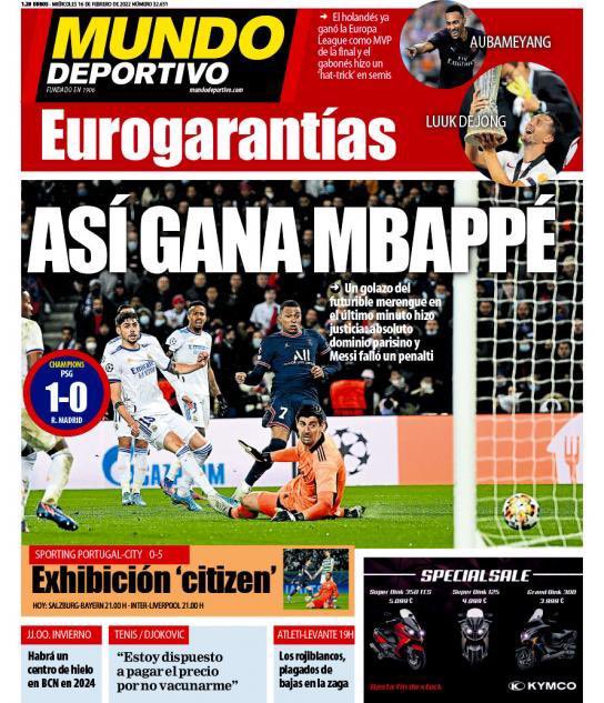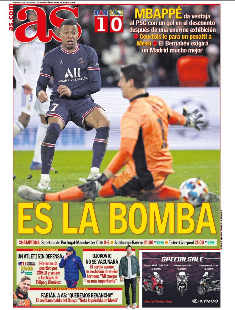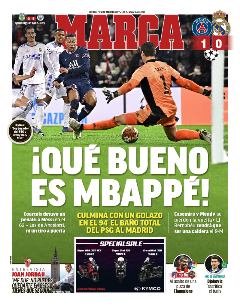 As nos informa de que Mbappé “es la bomba”. Gracias por la revelación, amigos. La portada recrea el momento fatídico (para nosotros, aunque sublime para el fútbol de los neutrales y de los antis) en que Kylian supera a Lucas Vázquez con una maniobra prodigiosa y cuela el balón entre las piernas de Thibaut.