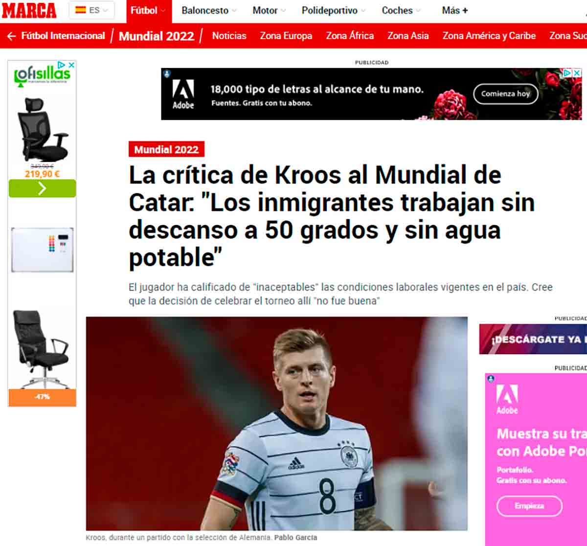 Tampoco hace referencia Marca a esta ignominia, pero no es el único: a excepción de Toni Kroos y del capitán de la selección finlandesa Tim Sparv, ningún futbolista de renombre ha hecho pública su opinión respecto a las condiciones infrahumanas en las que trabajan los inmigrantes que están construyendo las infraestructuras de este mundial de muerte. Tampoco los medios suelen hacerse eco, hay que tener en cuenta que hay medios cuyos accionistas son cataríes, y suponemos que no quieren poner en riesgo las lentejas. ¿Es ético? Parece claro que no, pero allá cada uno con su moral.