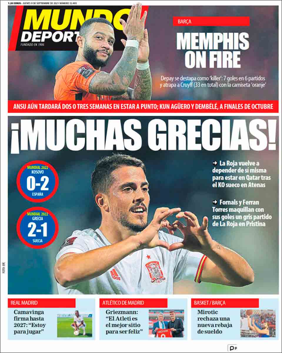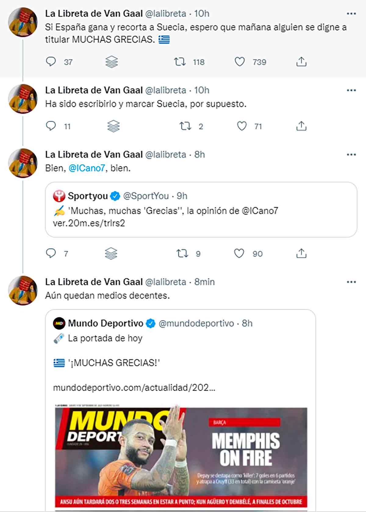 Terminamos con la prensa culé, pero solo hacer un guiño a La Libreta de Van Gaal, que en su cuenta de Twitter predijo: “Si España gana y recorta a Suecia, espero que mañana alguien se digne a titular MUCHAS GRECIAS”. Pues dicho y hecho. Mundo Deportivo (Sportyou también) es uno de los que se decantó por el simpático titular.