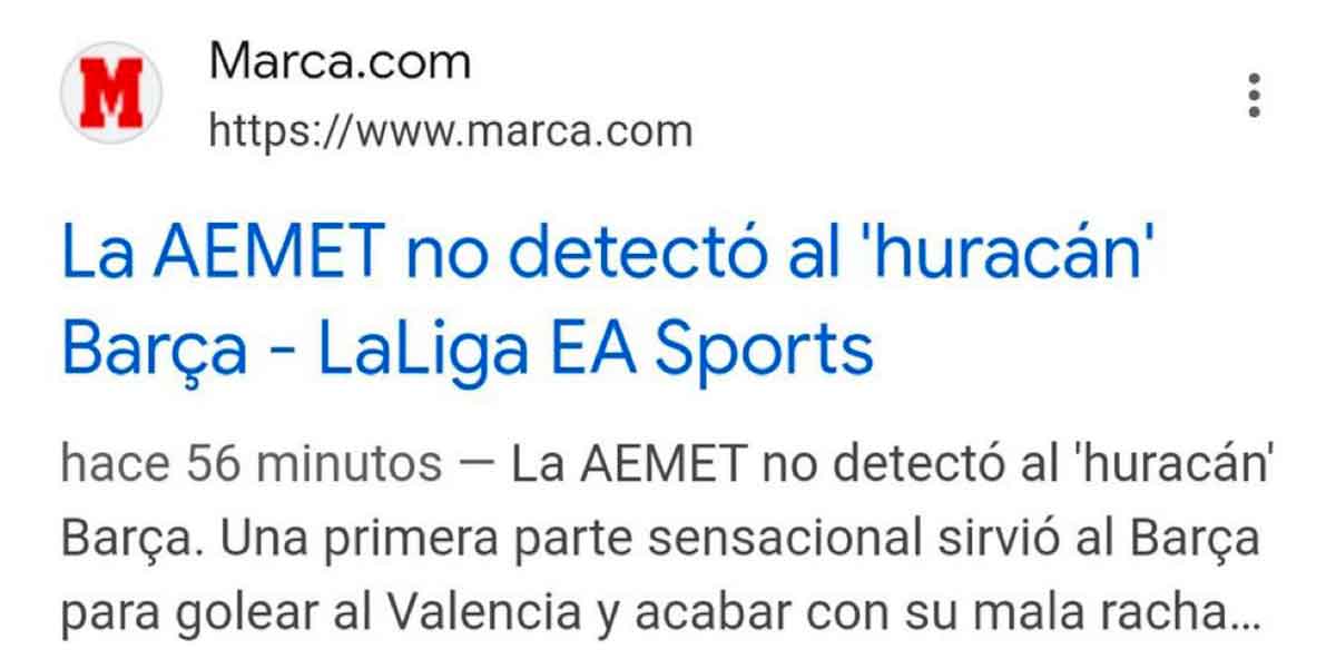 Qué sutileza, amigos. Qué consideración. Juega el equipo cliente de Negreira contra el Valencia, equipo bandera de la comunidad autónoma más trágicamente castigada por la DANA, y Marca se lanza con titulares “ingeniosos” sobre la AEMET y sus predicciones meteorológicas. Si esa es su idea de lo chispeante, más vale que sigan siendo aburridos. (Aporte de @maketolari).